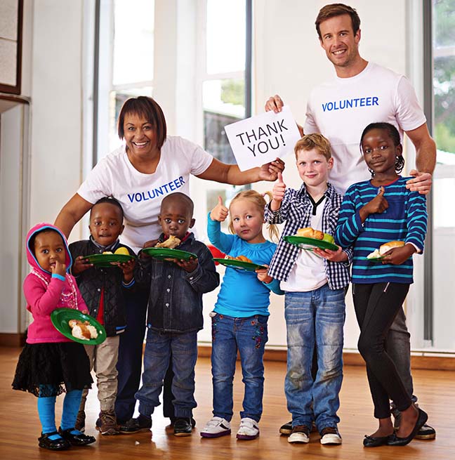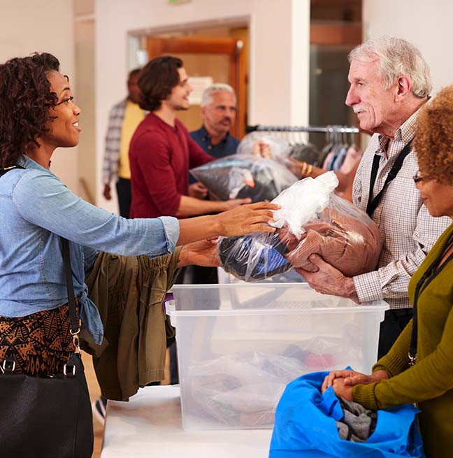 A man and a child fist bump outside near a crowd of people; the child holds a parcel while others stand and walk in the background.