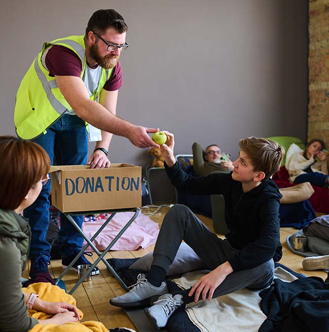 A person wearing a mask and gloves sorts green bags in front of piles of cardboard boxes at an outdoor distribution site.