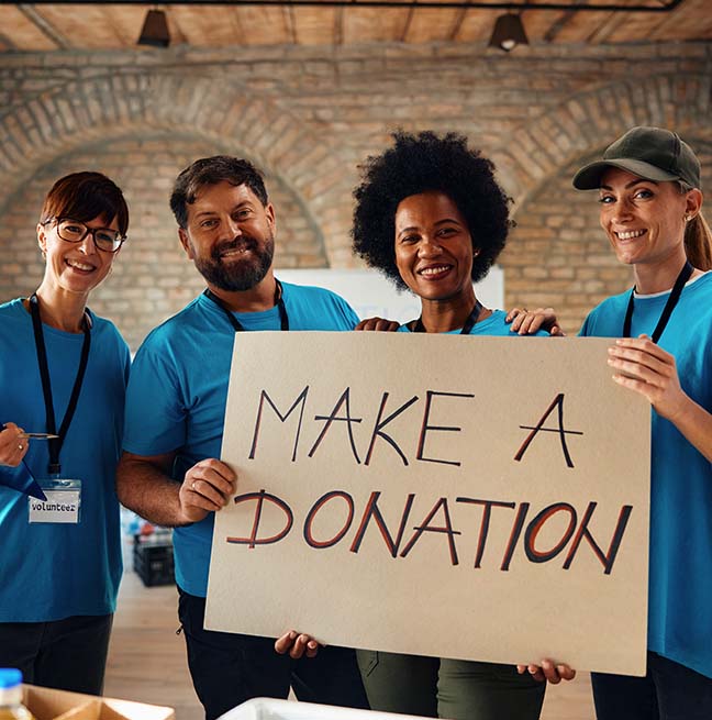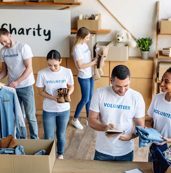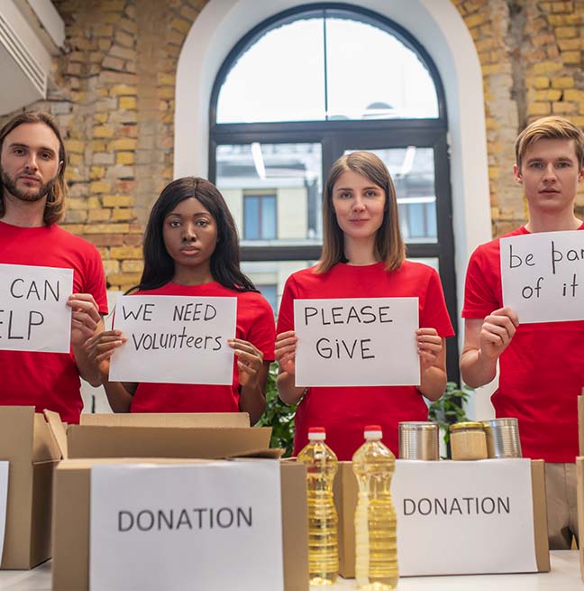 A blue tote bag with "WE CARE" printed on it, filled with various items, sits on grass at an outdoor event with people in the background.